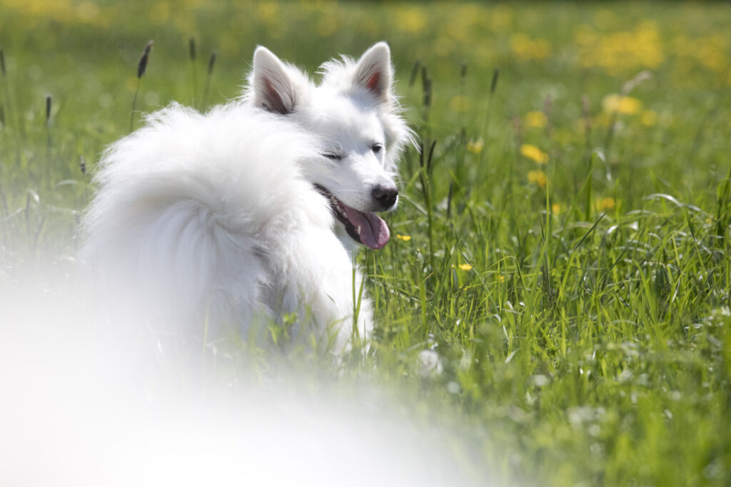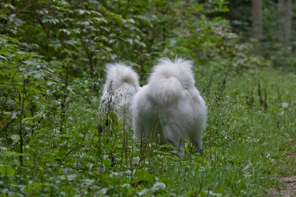 Ein junger Spitz reagiert genauso auf Bewegungsreize wie jeder andere junge Hund. So landen sie ohne Erziehung auch im Gebüsch, wenn es raschelt. Könnte ja auch eine Maus drin stecken. Was sie aber eindeutig von einem Husky oder auch anderen jagdlich ambitionierten Rassen unterscheidet, ein Spitz will nicht verloren gehen sondern hält Anschluss zu seinem Menschen. Auch erjagen Spitze kein Wild, Mäuschen hingegen schon und die werden je nach Geschmack auch verspeist. Cosima schluckt sie, Mali spuckt sie. 😛