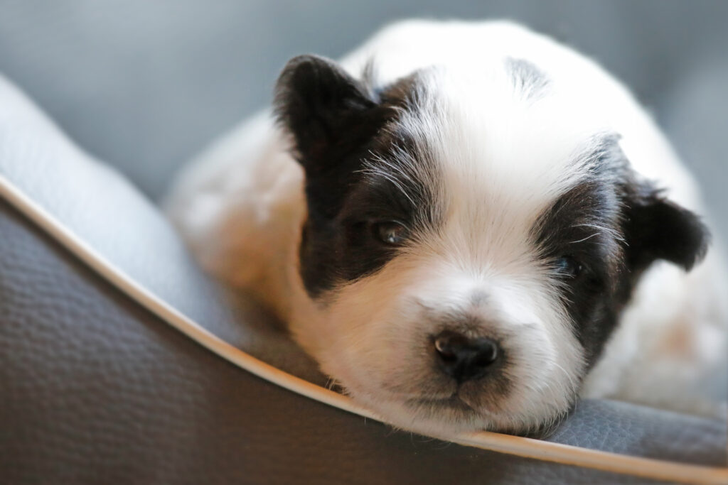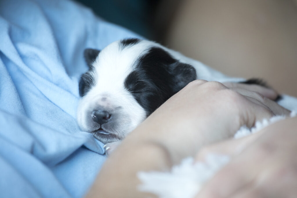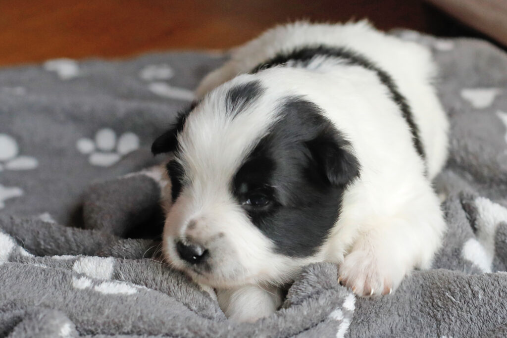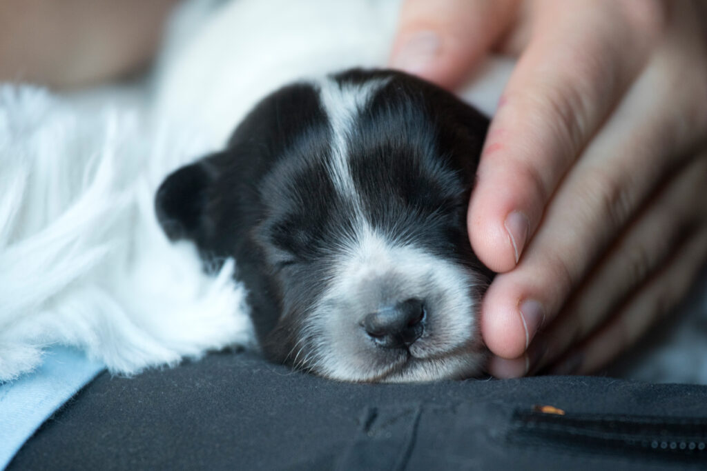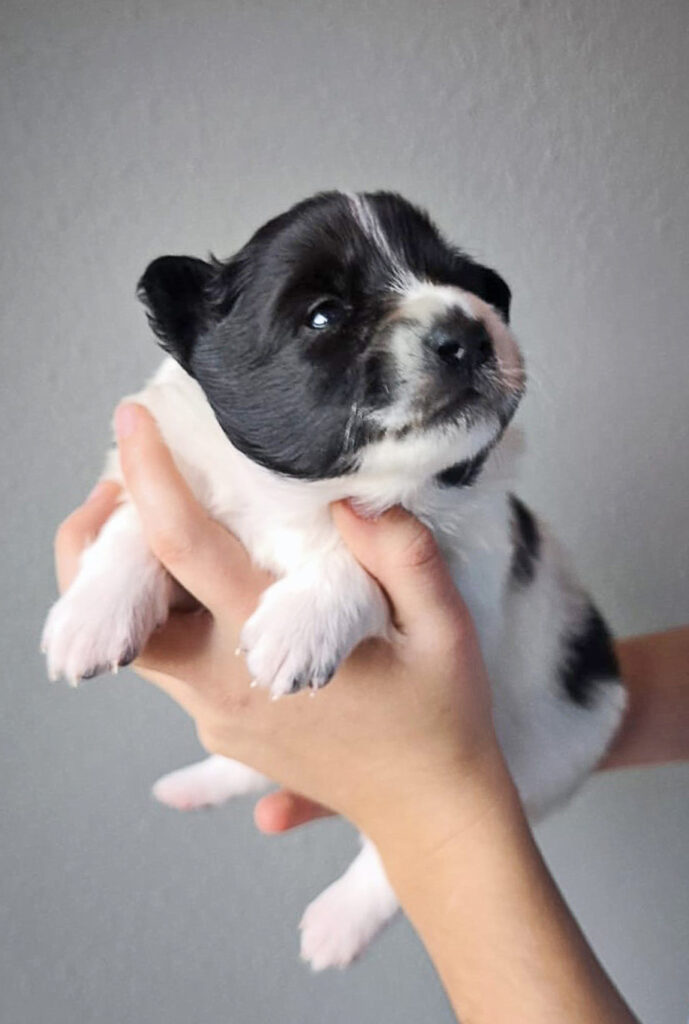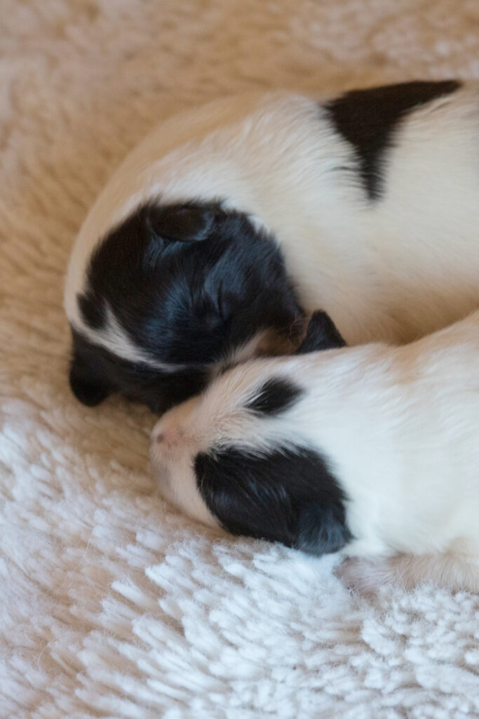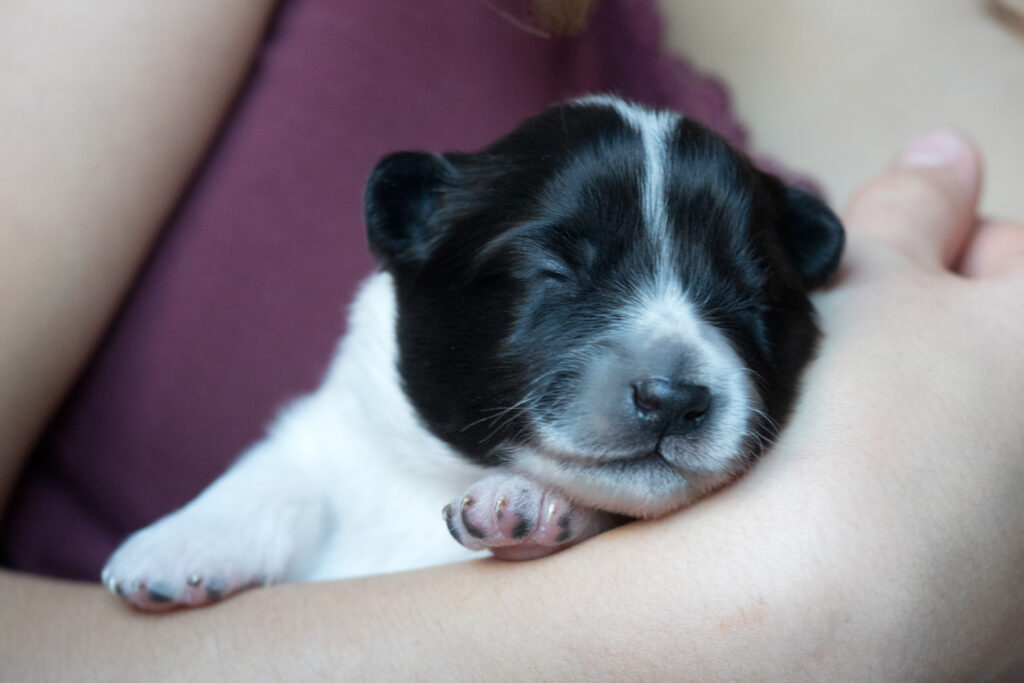 Unser „heller“ schwarzer Schecke ist ganz handzahmer ruhiger Welpe, der Liebling meiner großen Tochter. Sie hat ein Händchen für freundliche, verspielte Welpen. Ich bin gespannt, ob sie wieder Recht behält. Er ist nach seinem großen Bruder regelrecht auf die Welt geflutscht. Schnell war er ausgepackt, doch hat er sich erst einmal von der Mama wach schlecken lassen. Anschließend hat er sich gemütlich auf den Weg zur Milch gemacht.
