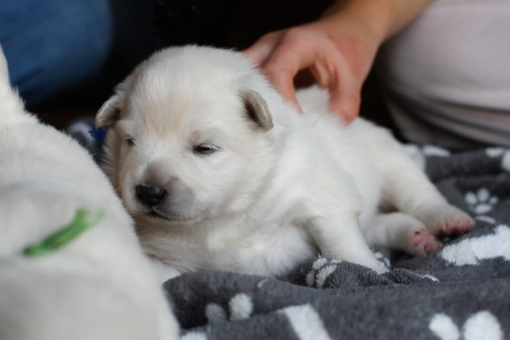 Tag 12 und alle bis auf unseren großen Weißen haben die Augen offen. Es ist so schön die Wurfkiste zu beobachten, wenn die Mama gut gestärkt nach einer reichhaltigen Mahlzeit zurück kommt. Da kommt Bewegung in die kleinen Bärchen.