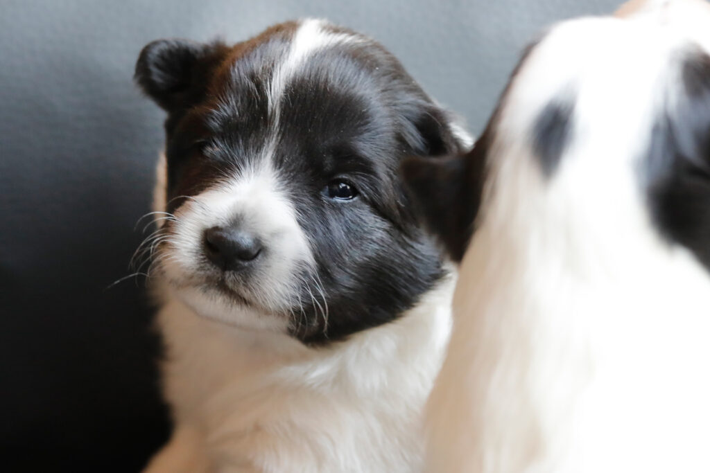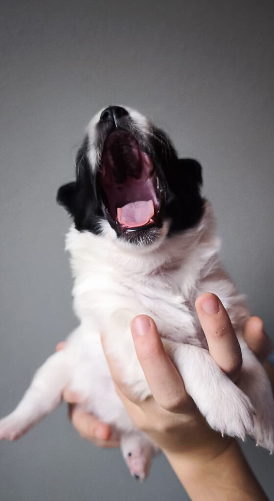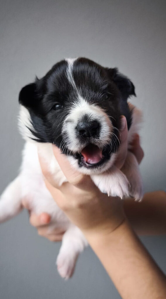 Während seine Brüder auch mal alleine liegen, ist er fast ausschließlich in Kontakt mit einem Geschwisterchen oder der Mama. Bei seiner Geburt war ich direkt begeistert von seiner hübschen Zeichnung. Gleich am zweiten Tag hat sein schwarz angefangen heller zu werden. Nun sind wir gespannt, ob er ein Mantelschecke in Wildfarbe oder Sable wird. Sucht er die Mama und findet sie nicht gleich, dann fängt er an zu rufen. Die Mama hält das geduldig aus, beobachtet ihn, aber lässt ihn selbst erfolgreich sein. Von einem anfänglichen Konzert sind wir jetzt schon bei sehr kurzen Gesangseinlagen.