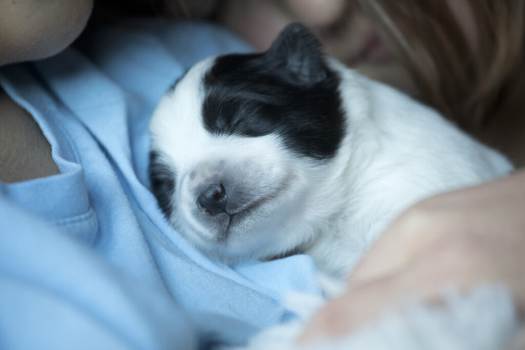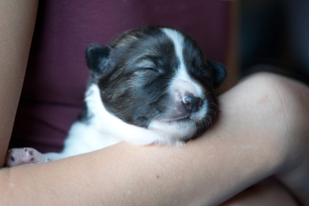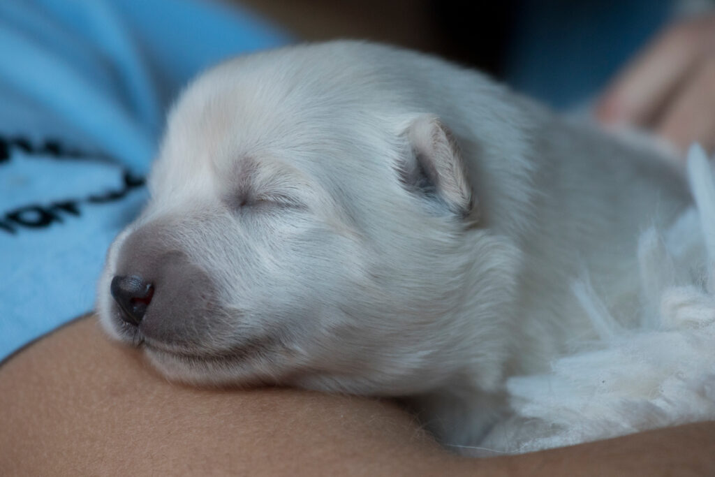 Heute Morgen, als ich an die Wurfkiste kam, lag er an einer der oberen Brüste. Ich dachte noch, dass mich das doch sehr überrascht. Und kaum hatte ich zu Ende gedacht, hat er sich unter allen Geschwistern durchgeschoben, völlig ohne Stress und mit ruhigen Bewegungen, um dann gemütlich am prallen großen Gesäuge anzudocken. Seine Lieblingsbeschäftigung ist schlafen und Fressen. Für einen erholsamen Schlaf sucht er sich auch gerne ein Kopfkissen. Ob das jetzt ein Bein der Mama, ihr Schwanz oder ein Geschwisterchen ist, egal, Hauptsache gemütlich. Wenn ich ihn zum Monitoring aus der Kiste hole, dann findet er die Störung beim Schlafen doof. Wenn man ihn dann aber in die Hände einkuschelt, ist er schnell wieder zufrieden. Bin ich auf unseren „Großen“ gespannt.
