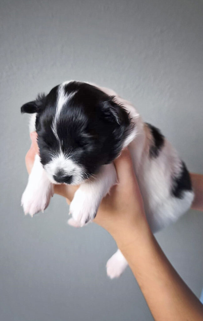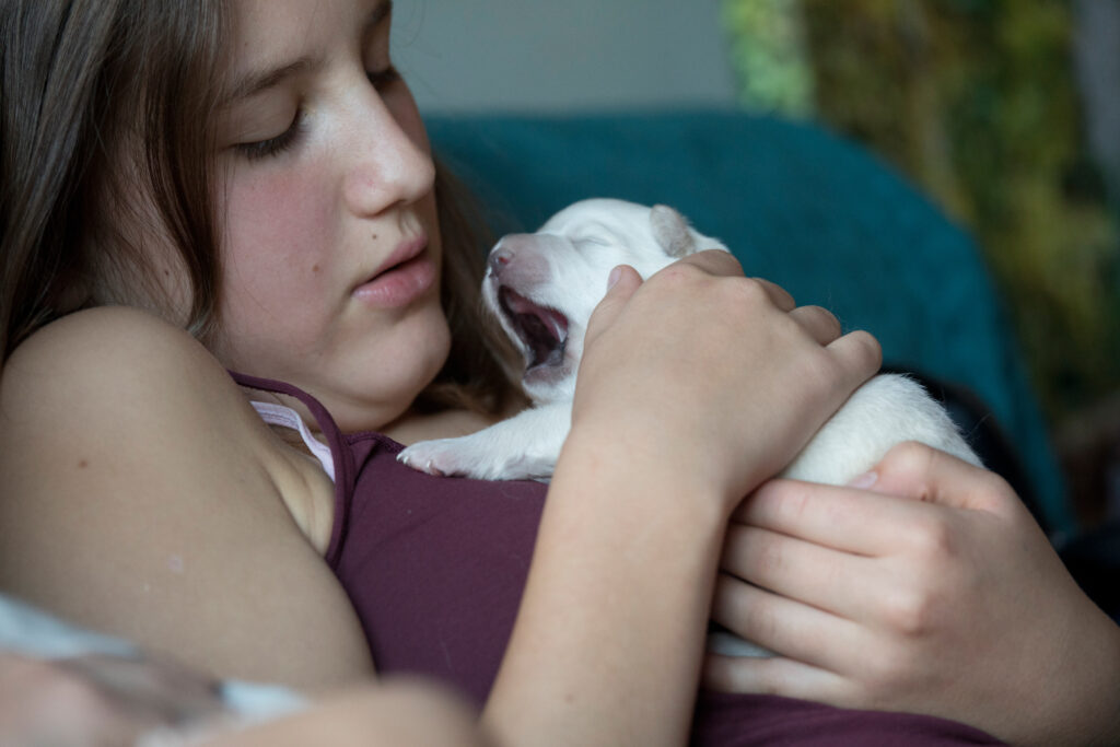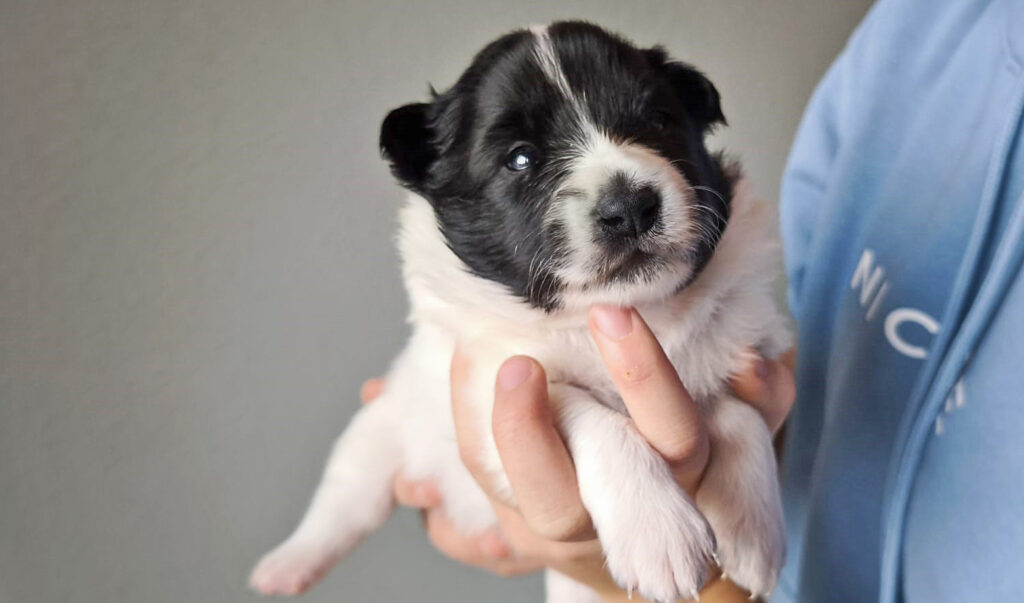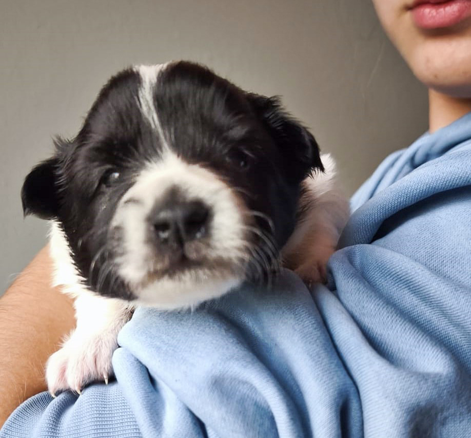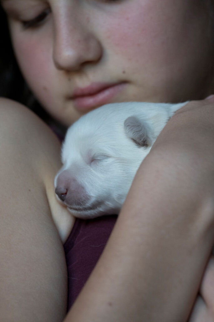 In der Hand ist er ganz friedlich und jeder darf sich bei ihm ankuscheln. Er ist seit der Geburt der Kleinste im Wurf, wächst aber wie seine Geschwister fleißig.