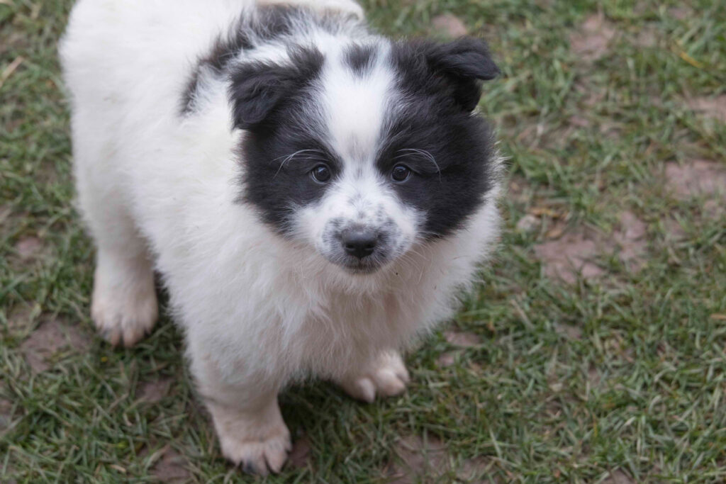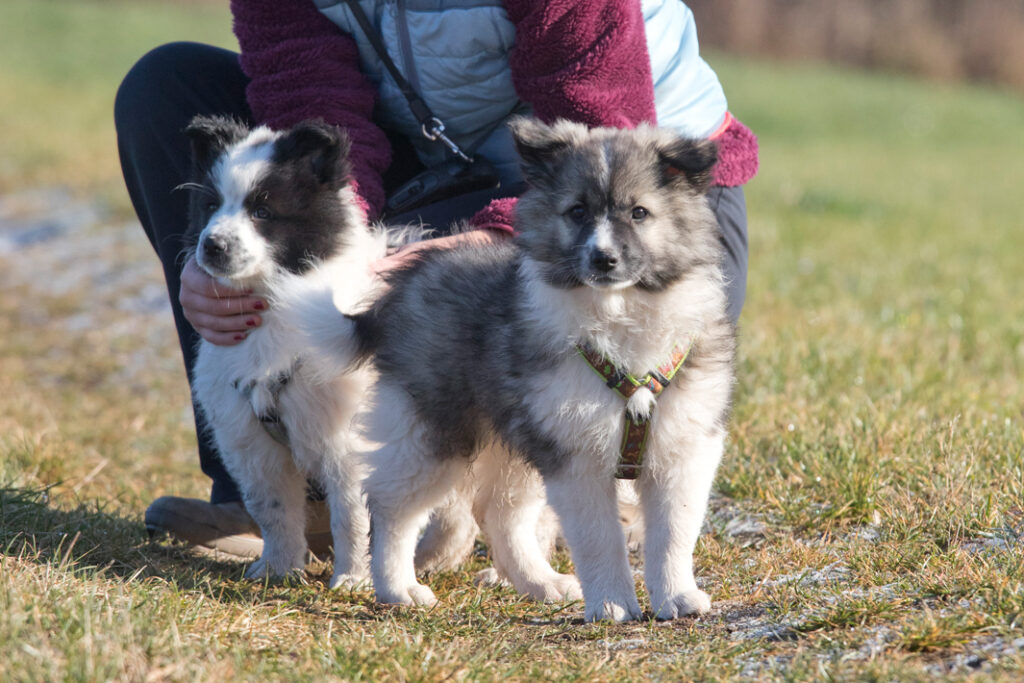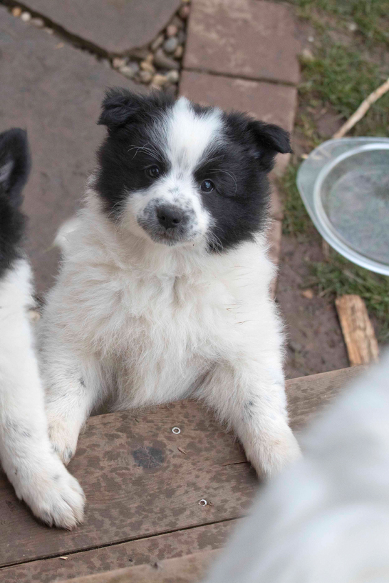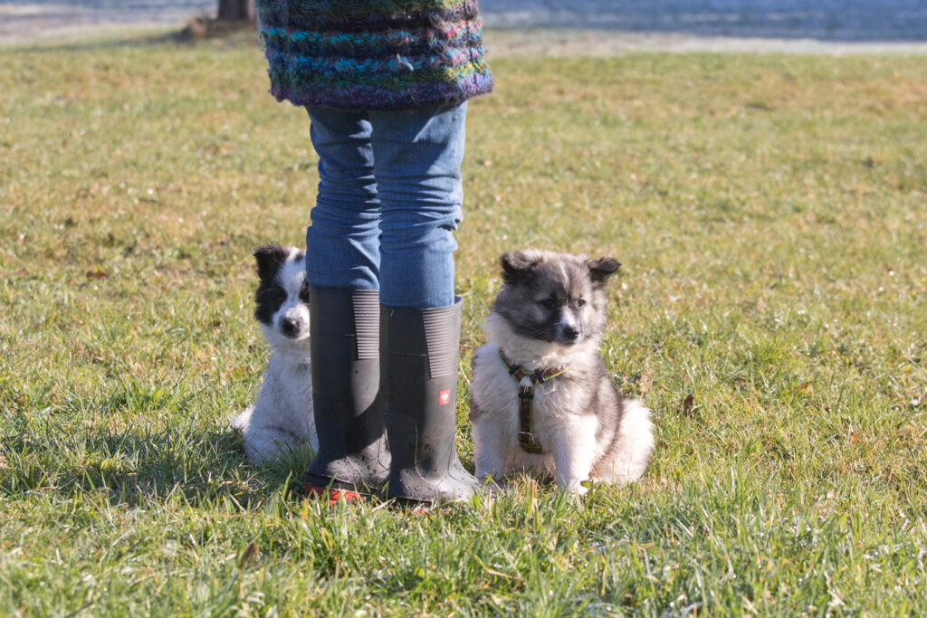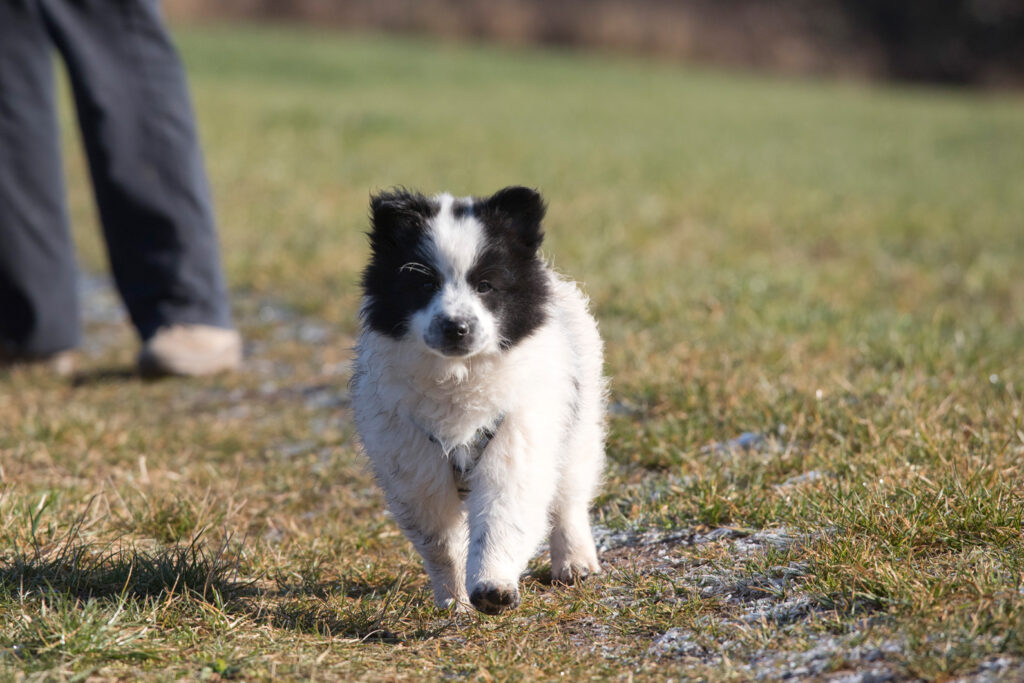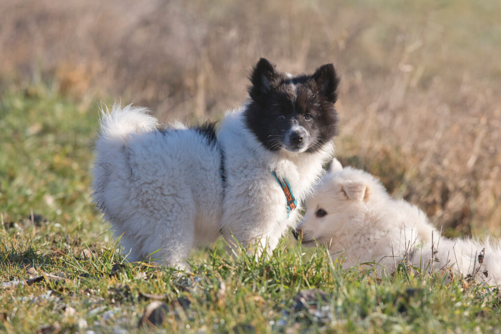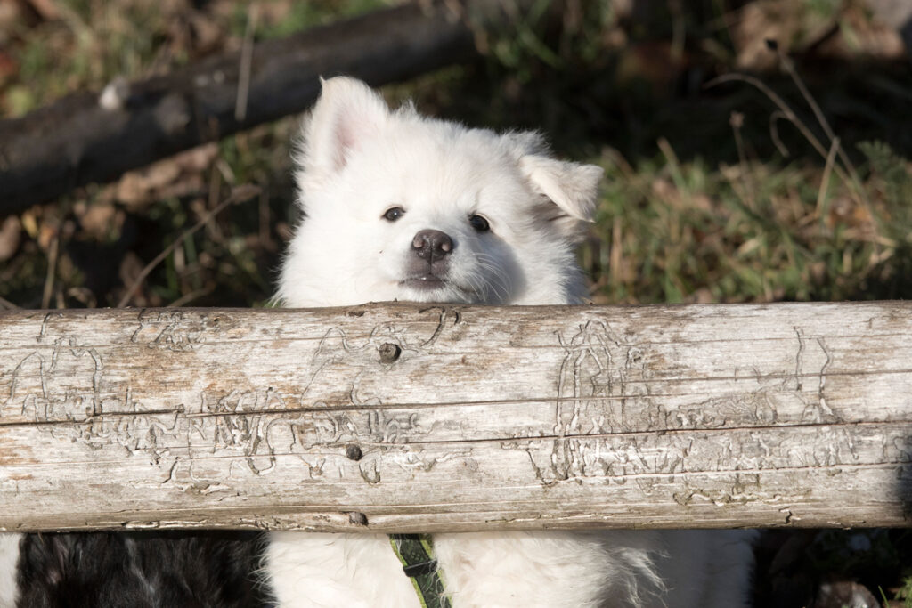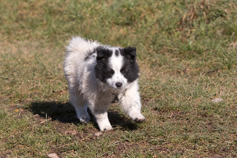 Die Welpen erkennen, wenn Menschen zu Besuch in den Auslauf kommen und mit einem ersten Schwanzwedeln kommen sie neugierig angewackelt. Allen voran der kleine Weiße und der helle Schecke. Dicht gefolgt vom wildfarbenen Bruder.