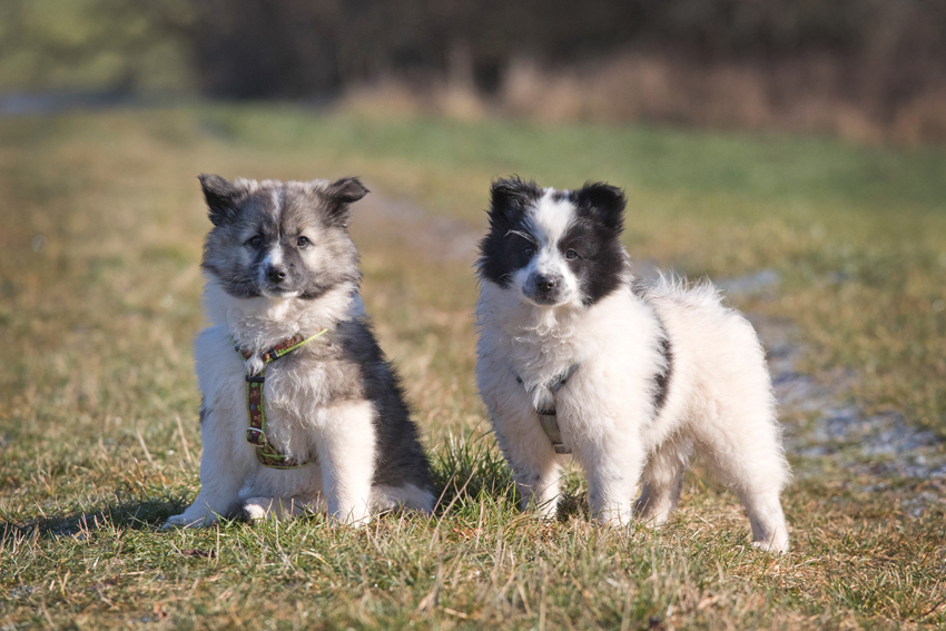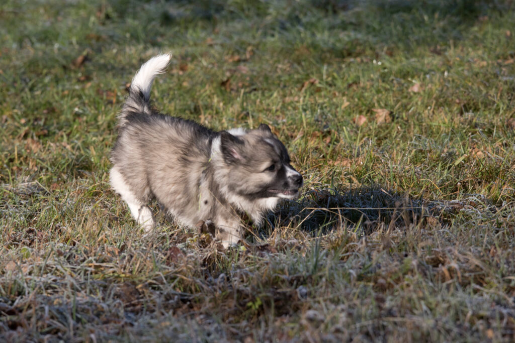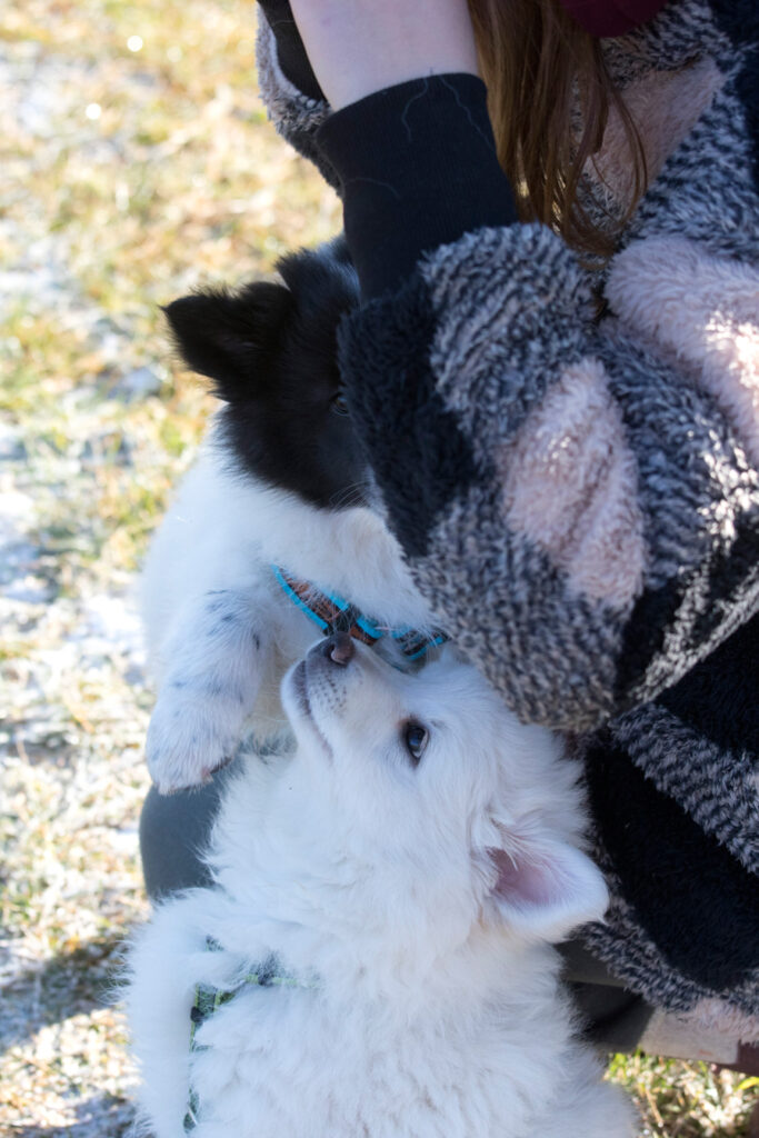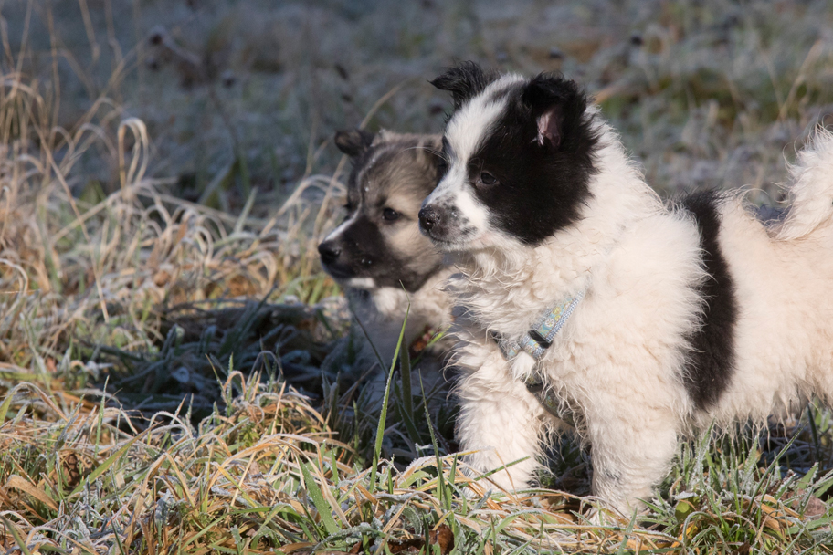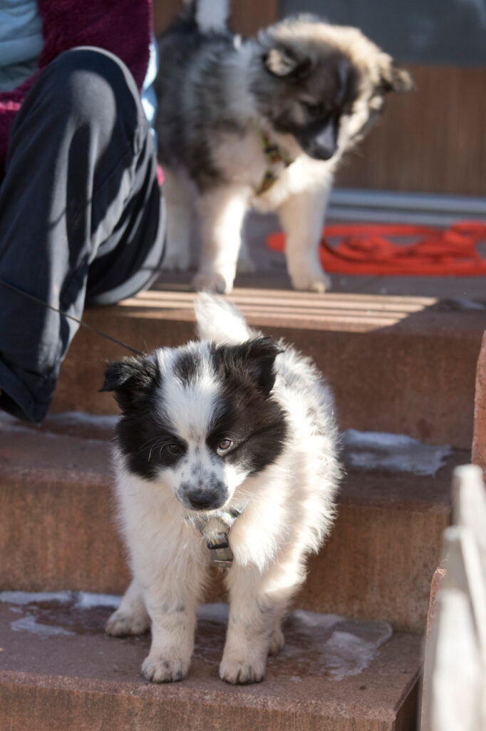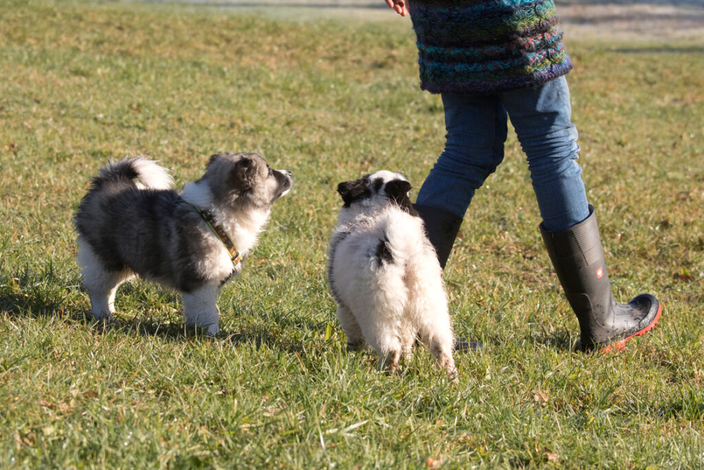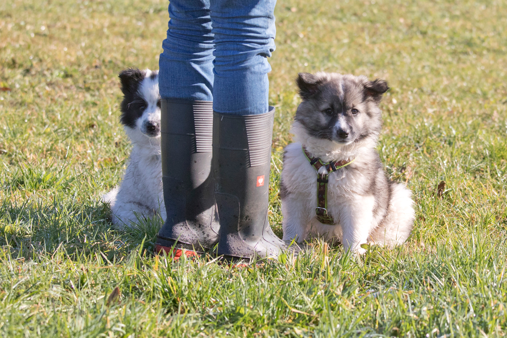Die Welpen erkennen, wenn Menschen zu Besuch in den Auslauf kommen und mit einem ersten Schwanzwedeln kommen sie neugierig angewackelt. Allen voran der kleine Weiße und der helle Schecke. Dicht gefolgt vom wildfarbenen Bruder.