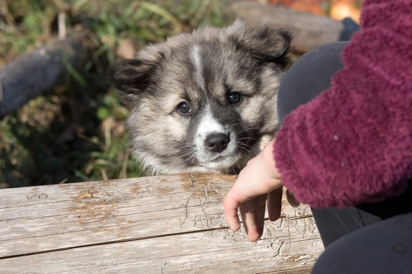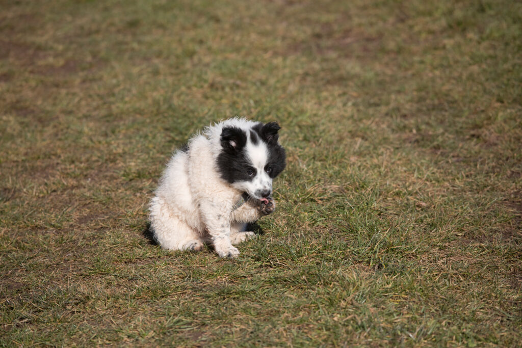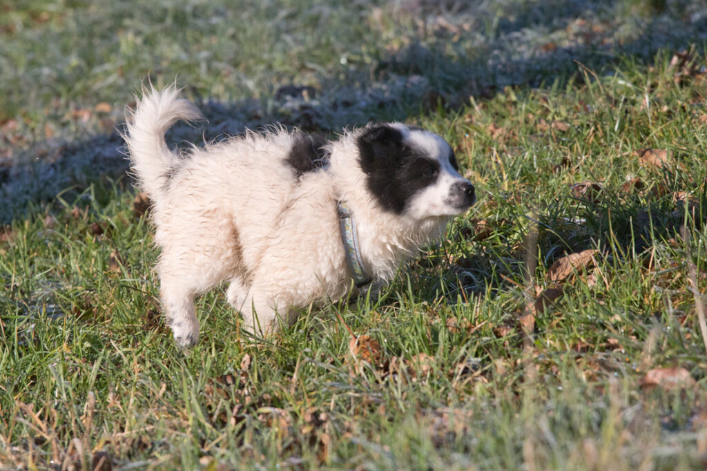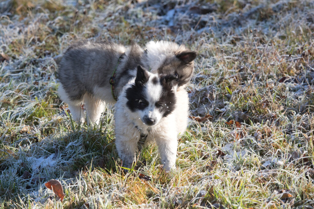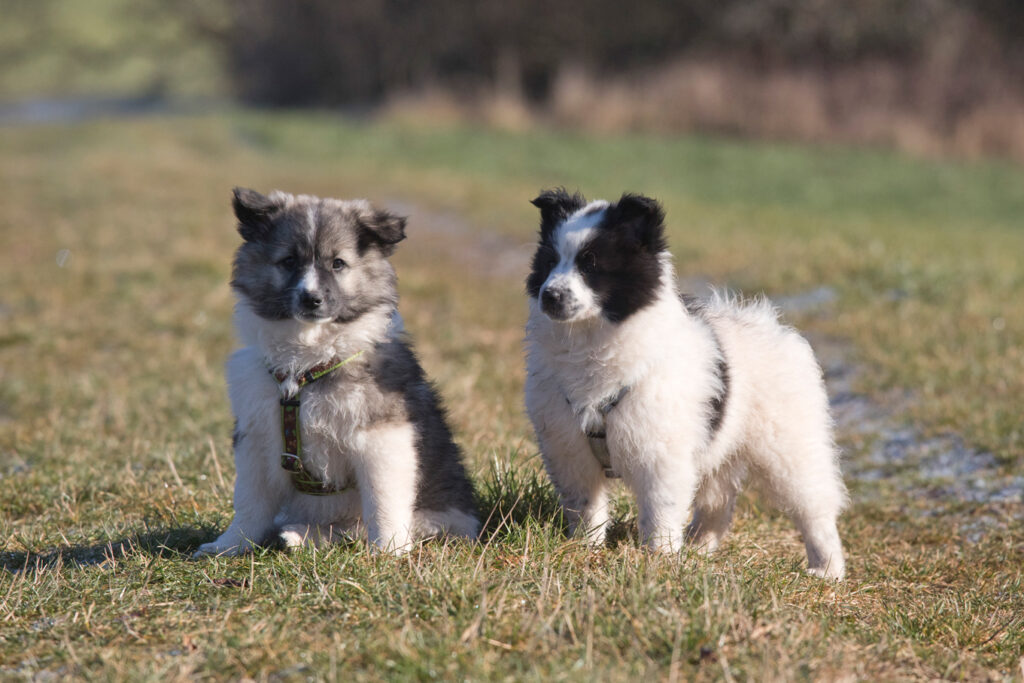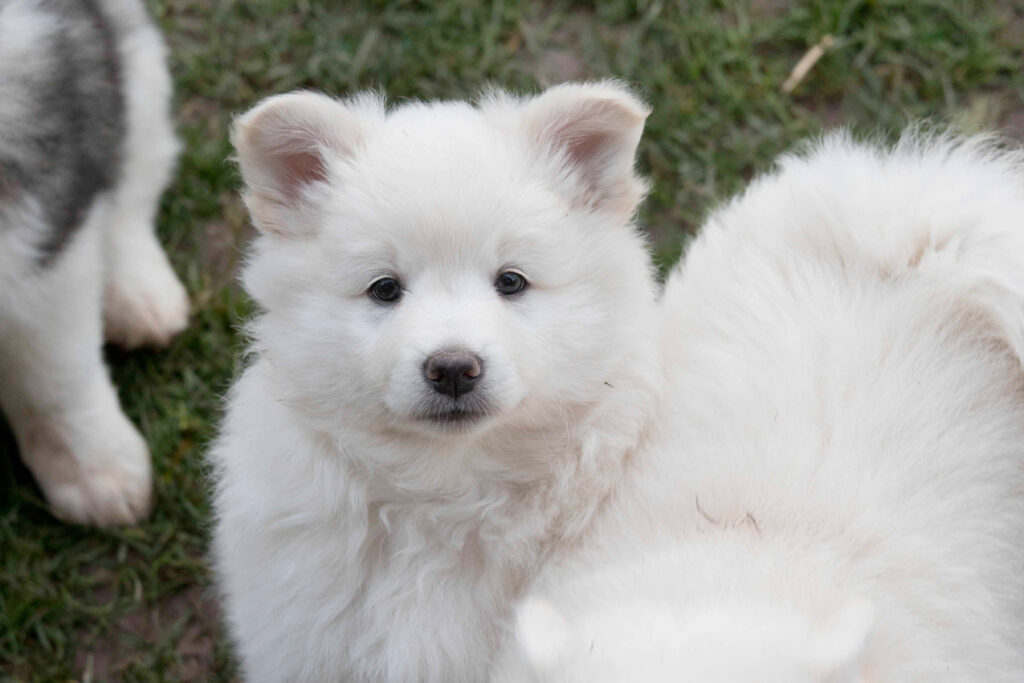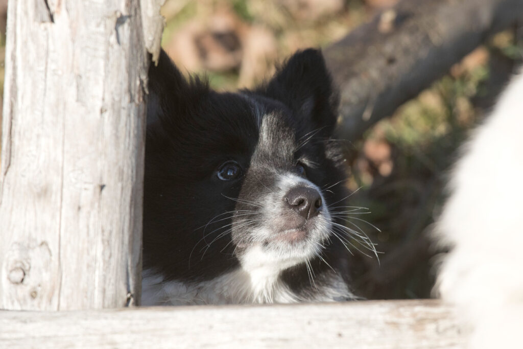 Die Welpen erkennen, wenn Menschen zu Besuch in den Auslauf kommen und mit einem ersten Schwanzwedeln kommen sie neugierig angewackelt. Allen voran der kleine Weiße und der helle Schecke. Dicht gefolgt vom wildfarbenen Bruder.