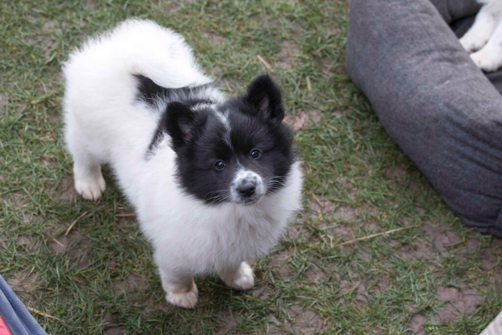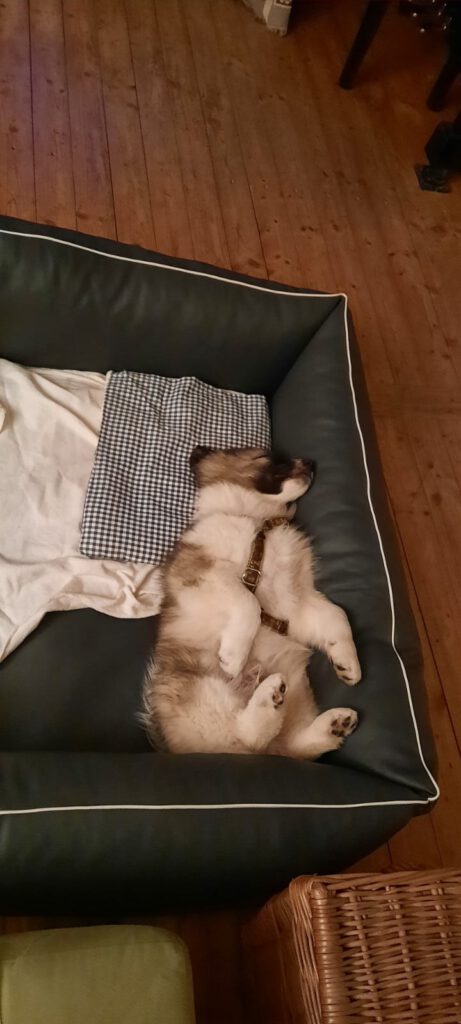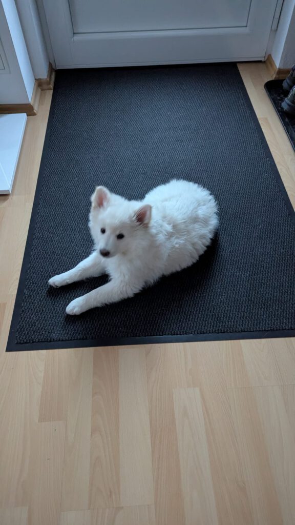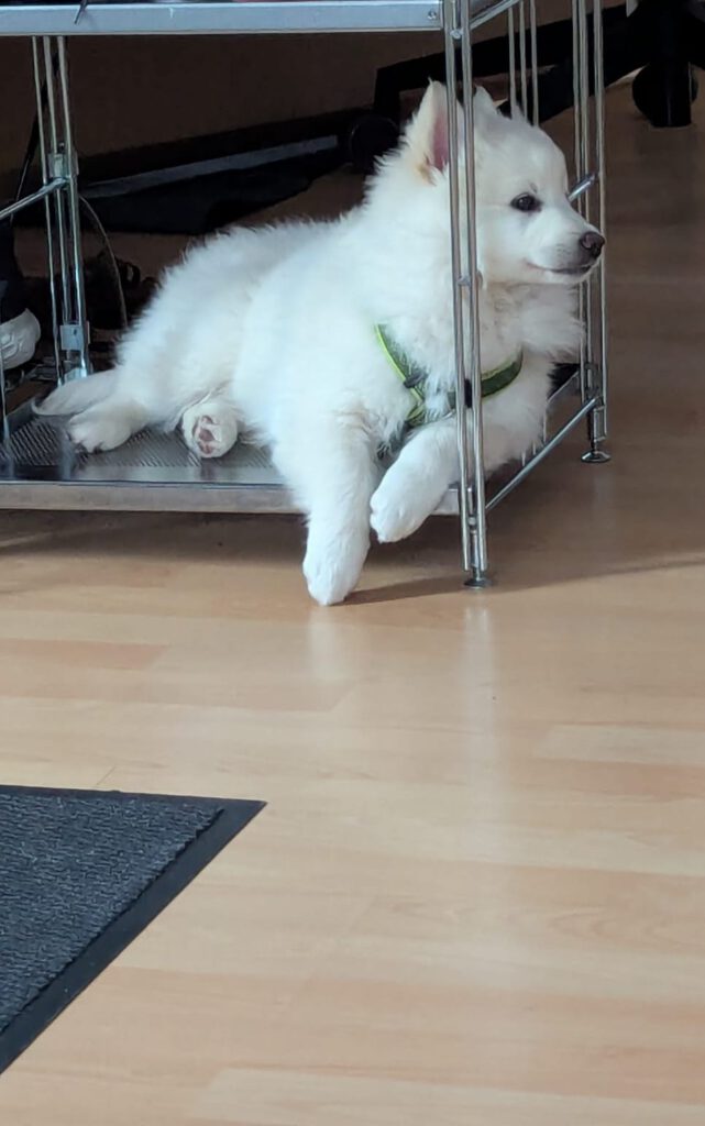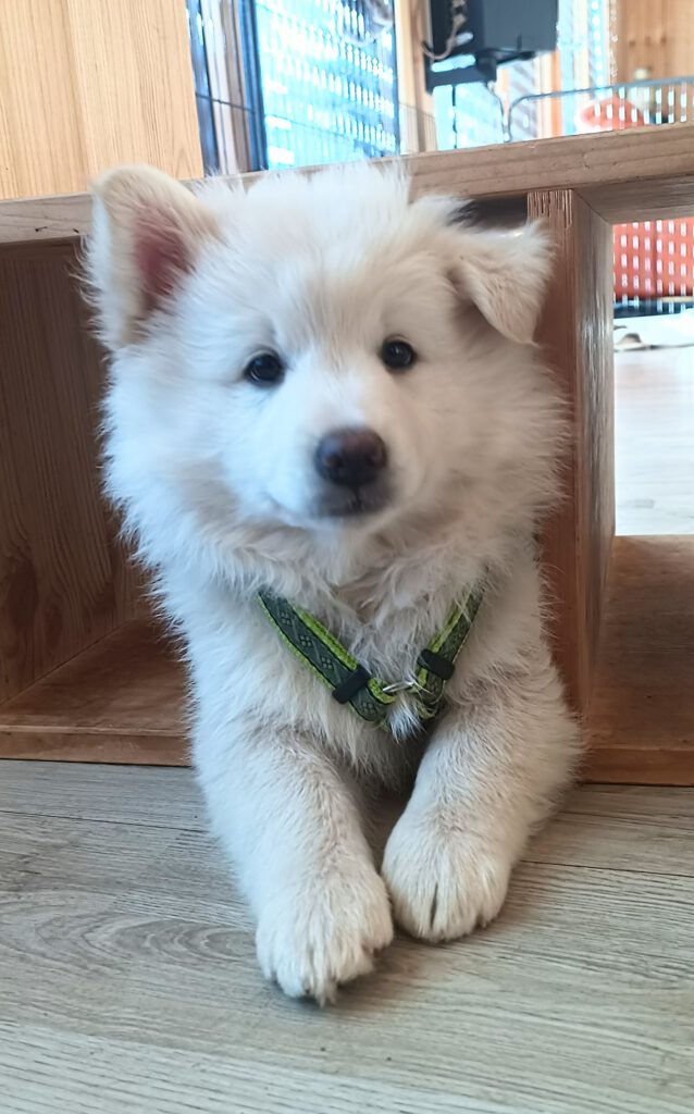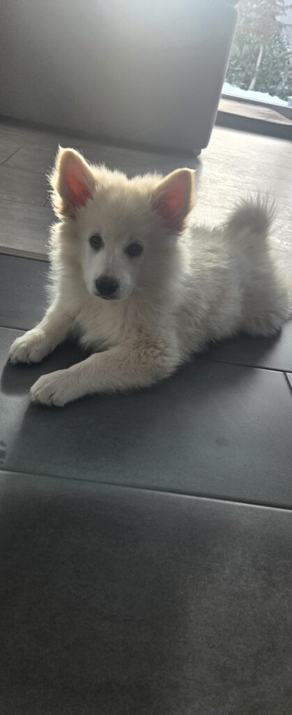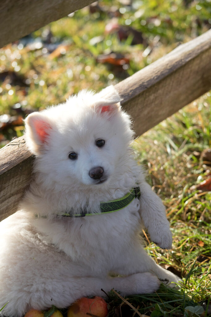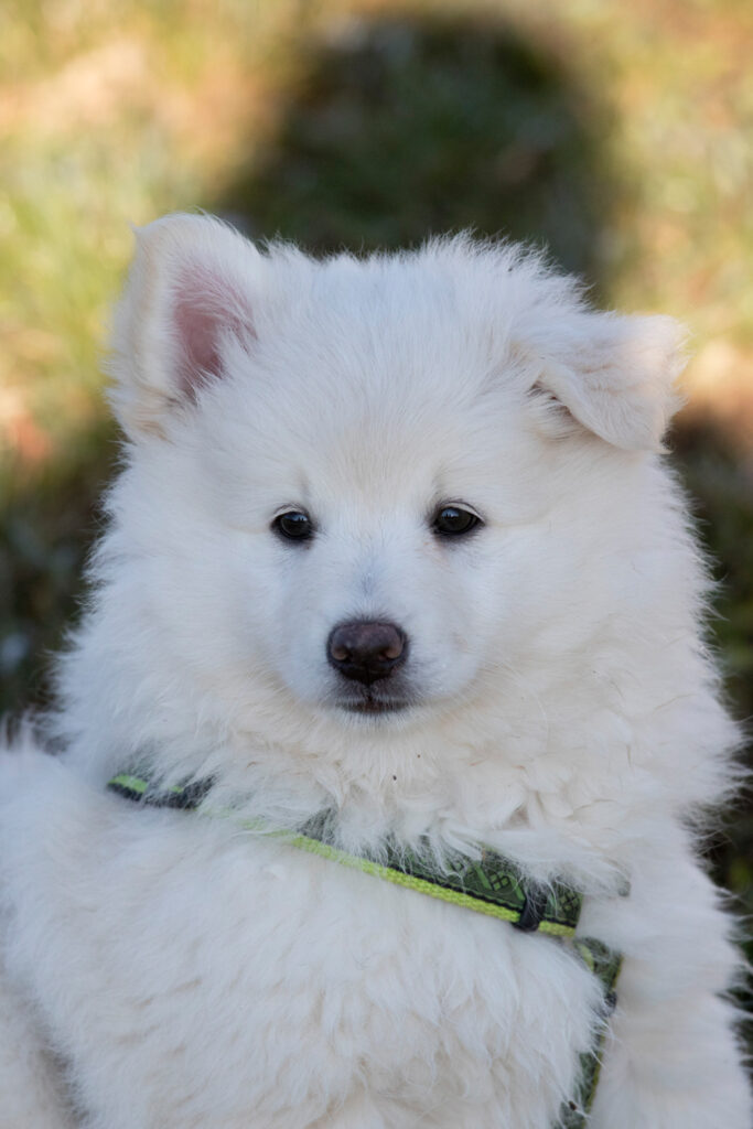 Dieser Schönling, unser Erstgeborener, hat die Mama so viele Wehen gekostet, dass ich doch tatsächlich nachgeprüft habe, ob er quer liegt. Er ist schon immer ein kleiner Dickschädel und bringt daher aber auch jede Menge Gelassenheit zwischen den Geschwistern mit. Wenn er schlafen will, dann schläft er, egal, ob die anderen Raufen. Wenn er aber rauft, entscheidet er die Partie oft über Präsens bzw. Körpergewicht. An ihm prallen alle ab. 😀 Wenn ich das so schreibe, dann muss ich lachen. Nägelschneiden funktioniert prima, wenn er will, wenn nicht, dann ist es eine Herausforderung. Wenn es in den Garten geht und er muss warten, bzw. wenn er gerne Action außerhalb des Auslaufs hätte und er muss warten, dann schimpft er heftig. Das hat natürlich zur Folge, dass er jetzt immer zuletzt raus darf. Seine Mama pickt ihn auch immer wieder bewusst aus den Geschwistern und sagt ihm, wo ihre Grenzen sind. Er hat passend zum Wesen ganz dichtes Eisbärfell. So wurde er bei unserem letzten Welpenbesuch in den Schlaf gekrault, ich glaube das wäre nach dem Geschmack unseres kleinen Prinzen.