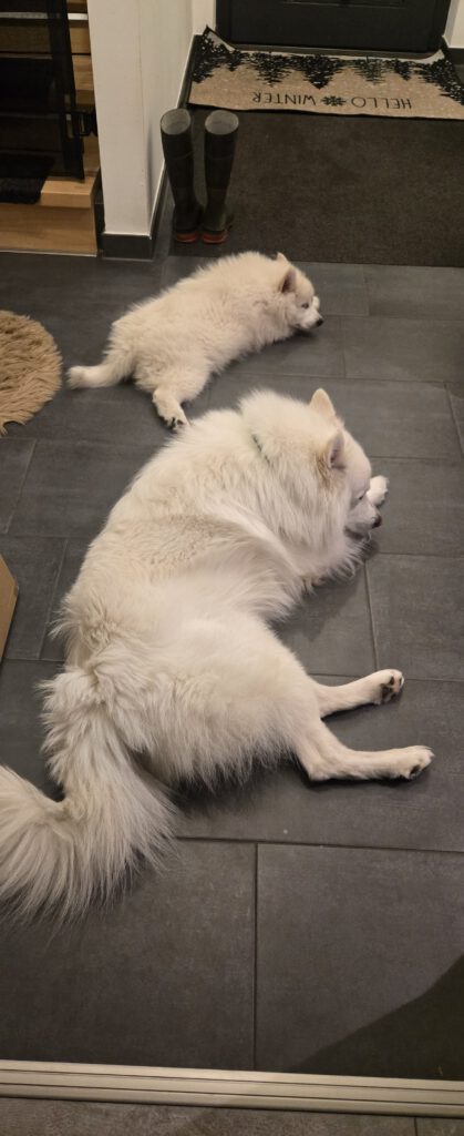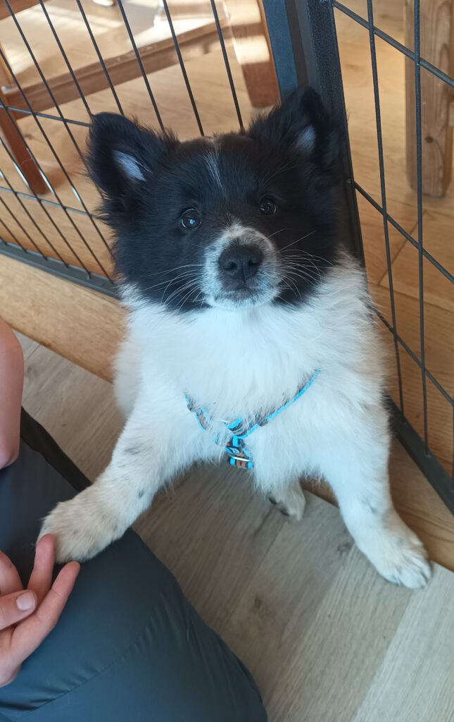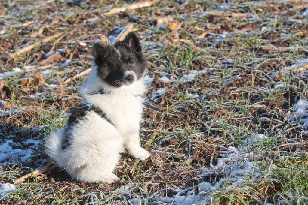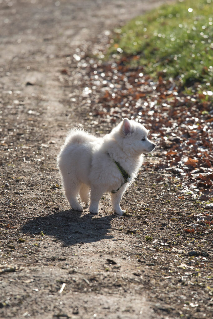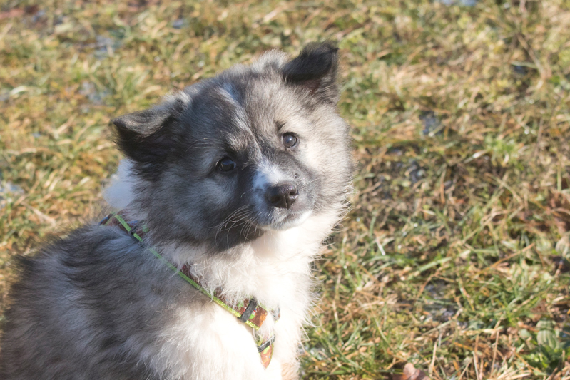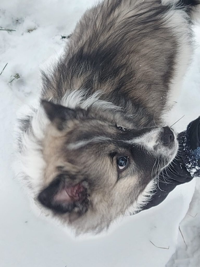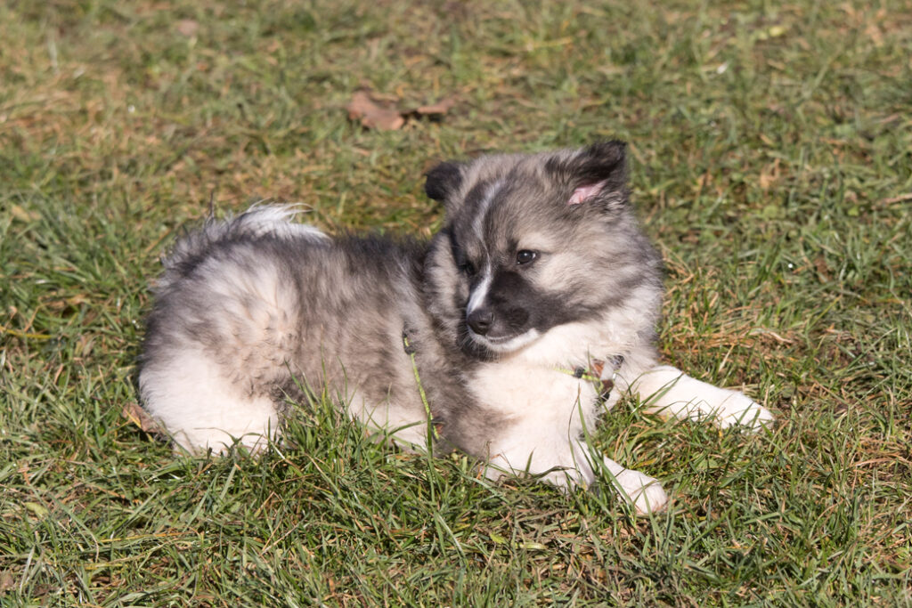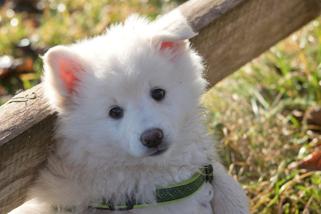 Dieser Schönling, unser Erstgeborener, hat die Mama so viele Wehen gekostet, dass ich doch tatsächlich nachgeprüft habe, ob er quer liegt. Er ist schon immer ein kleiner Dickschädel und bringt daher aber auch jede Menge Gelassenheit zwischen den Geschwistern mit. Wenn er schlafen will, dann schläft er, egal, ob die anderen Raufen. Wenn er aber rauft, entscheidet er die Partie oft über Präsens bzw. Körpergewicht. An ihm prallen alle ab. 😀 Wenn ich das so schreibe, dann muss ich lachen. Nägelschneiden funktioniert prima, wenn er will, wenn nicht, dann ist es eine Herausforderung. Wenn es in den Garten geht und er muss warten, bzw. wenn er gerne Action außerhalb des Auslaufs hätte und er muss warten, dann schimpft er heftig. Das hat natürlich zur Folge, dass er jetzt immer zuletzt raus darf. Seine Mama pickt ihn auch immer wieder bewusst aus den Geschwistern und sagt ihm, wo ihre Grenzen sind. Er hat passend zum Wesen ganz dichtes Eisbärfell. So wurde er bei unserem letzten Welpenbesuch in den Schlaf gekrault, ich glaube das wäre nach dem Geschmack unseres kleinen Prinzen.