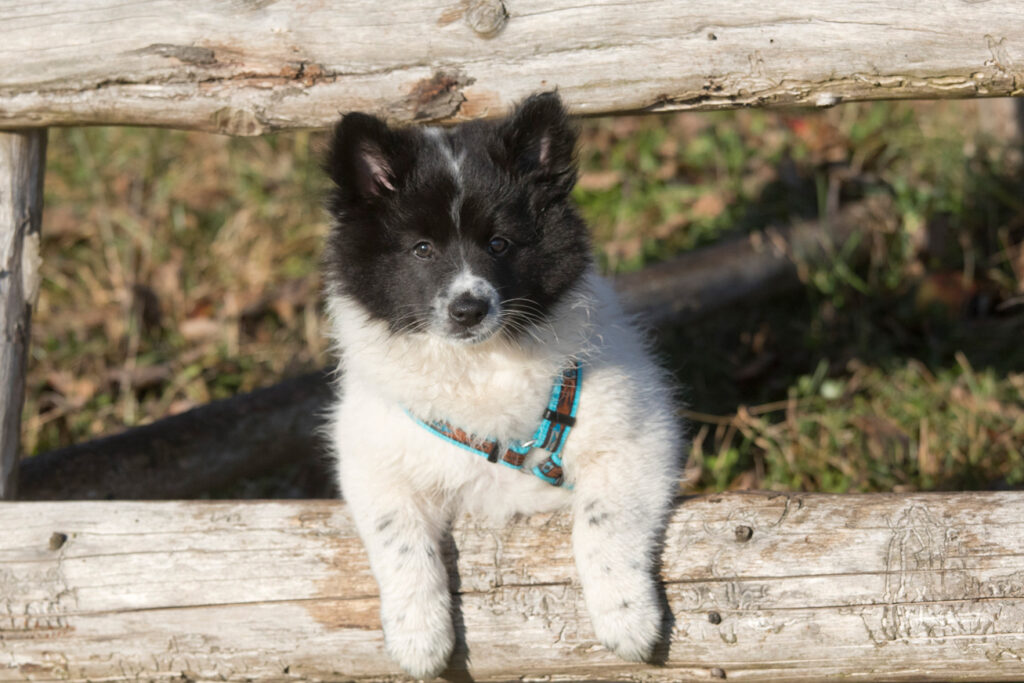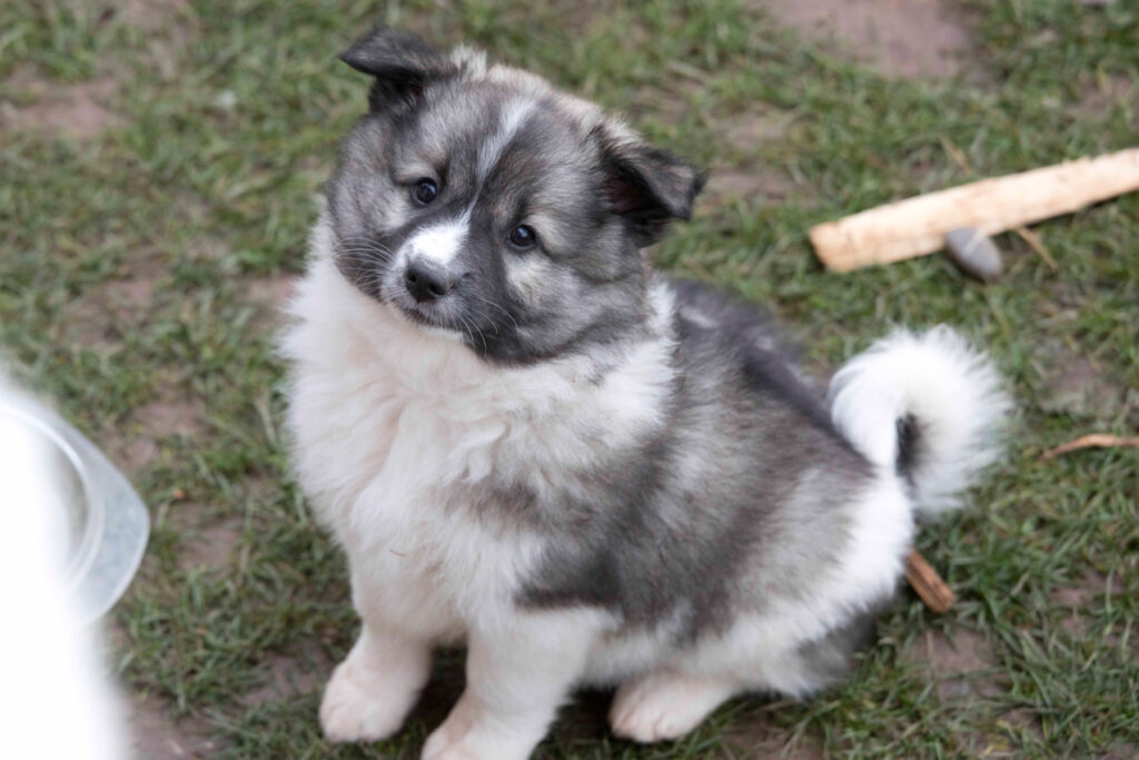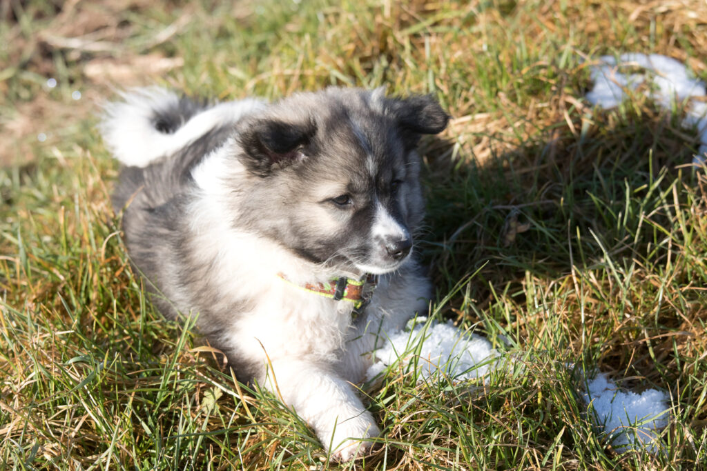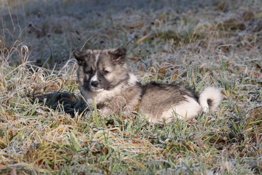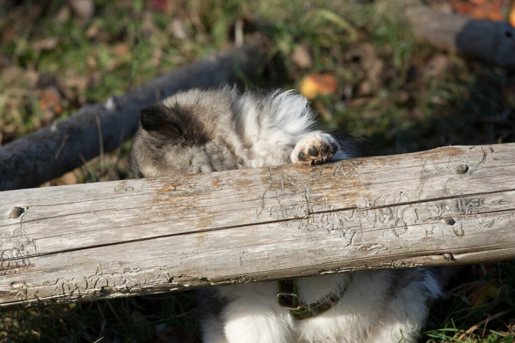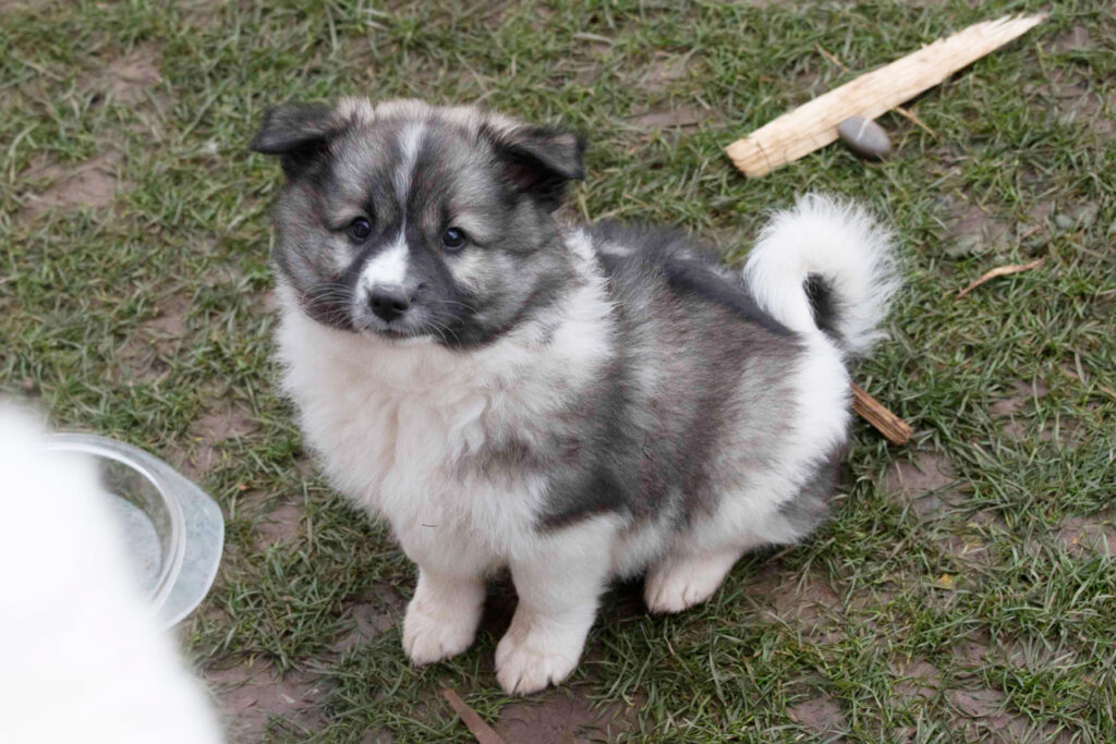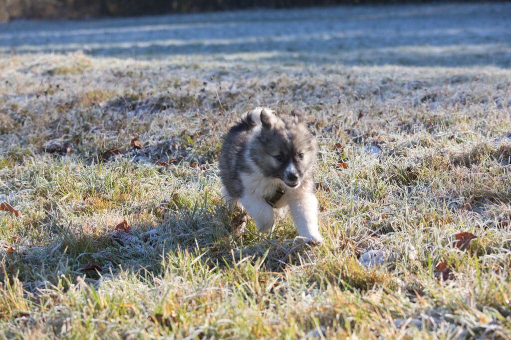 Dieser Schönling, unser Erstgeborener, hat die Mama so viele Wehen gekostet, dass ich doch tatsächlich nachgeprüft habe, ob er quer liegt. Er ist schon immer ein kleiner Dickschädel und bringt daher aber auch jede Menge Gelassenheit zwischen den Geschwistern mit. Wenn er schlafen will, dann schläft er, egal, ob die anderen Raufen. Wenn er aber rauft, entscheidet er die Partie oft über Präsens bzw. Körpergewicht. An ihm prallen alle ab. 😀 Wenn ich das so schreibe, dann muss ich lachen. Nägelschneiden funktioniert prima, wenn er will, wenn nicht, dann ist es eine Herausforderung. Wenn es in den Garten geht und er muss warten, bzw. wenn er gerne Action außerhalb des Auslaufs hätte und er muss warten, dann schimpft er heftig. Das hat natürlich zur Folge, dass er jetzt immer zuletzt raus darf. Seine Mama pickt ihn auch immer wieder bewusst aus den Geschwistern und sagt ihm, wo ihre Grenzen sind. Er hat passend zum Wesen ganz dichtes Eisbärfell. So wurde er bei unserem letzten Welpenbesuch in den Schlaf gekrault, ich glaube das wäre nach dem Geschmack unseres kleinen Prinzen.