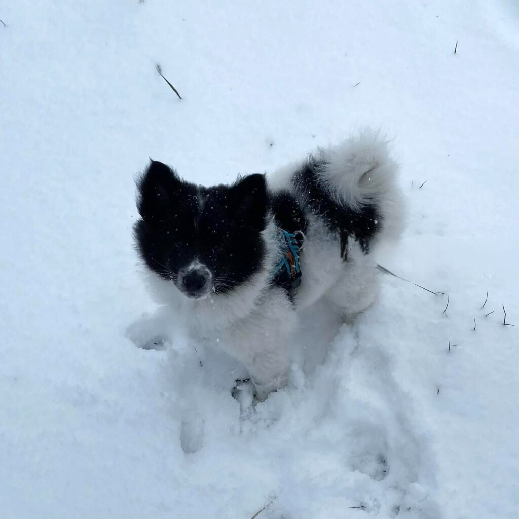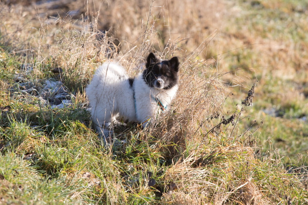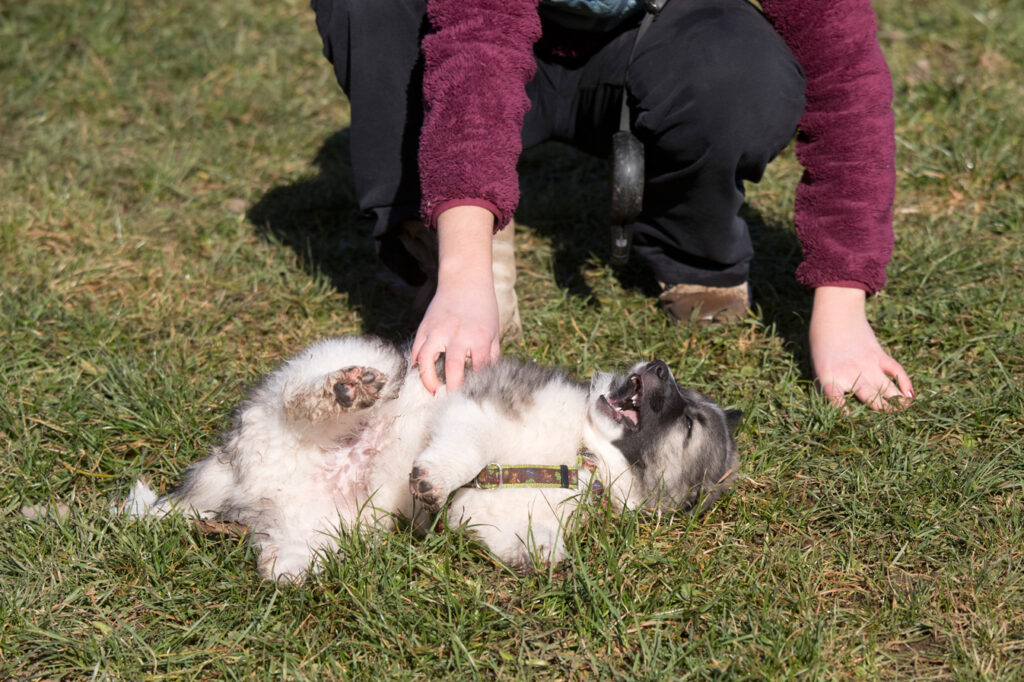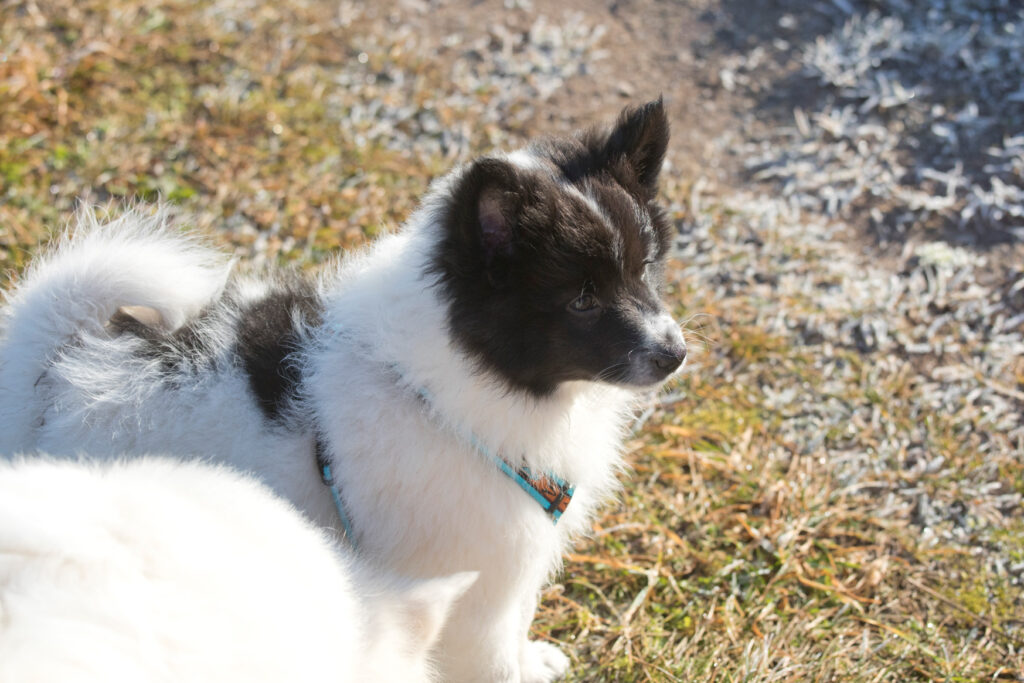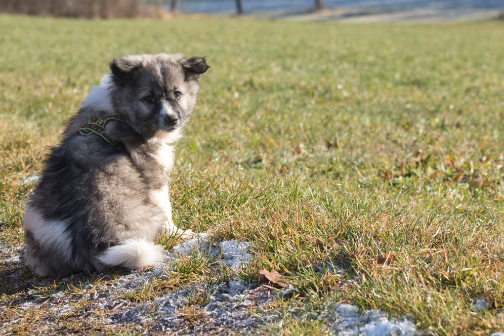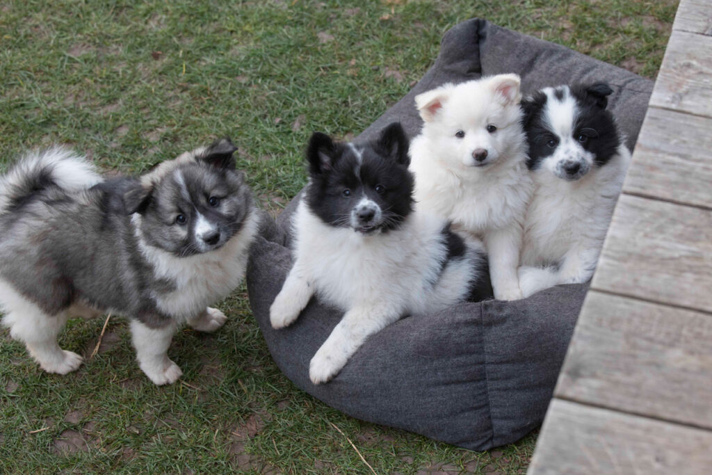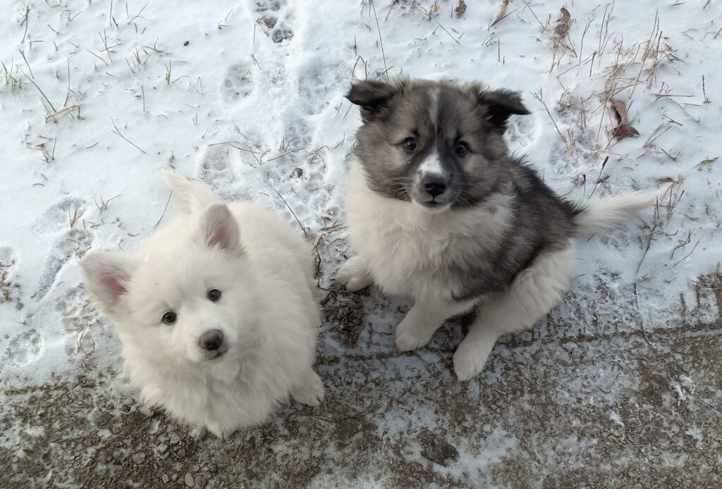 Dieser Schönling, unser Erstgeborener, hat die Mama so viele Wehen gekostet, dass ich doch tatsächlich nachgeprüft habe, ob er quer liegt. Er ist schon immer ein kleiner Dickschädel und bringt daher aber auch jede Menge Gelassenheit zwischen den Geschwistern mit. Wenn er schlafen will, dann schläft er, egal, ob die anderen Raufen. Wenn er aber rauft, entscheidet er die Partie oft über Präsens bzw. Körpergewicht. An ihm prallen alle ab. 😀 Wenn ich das so schreibe, dann muss ich lachen. Nägelschneiden funktioniert prima, wenn er will, wenn nicht, dann ist es eine Herausforderung. Wenn es in den Garten geht und er muss warten, bzw. wenn er gerne Action außerhalb des Auslaufs hätte und er muss warten, dann schimpft er heftig. Das hat natürlich zur Folge, dass er jetzt immer zuletzt raus darf. Seine Mama pickt ihn auch immer wieder bewusst aus den Geschwistern und sagt ihm, wo ihre Grenzen sind. Er hat passend zum Wesen ganz dichtes Eisbärfell. So wurde er bei unserem letzten Welpenbesuch in den Schlaf gekrault, ich glaube das wäre nach dem Geschmack unseres kleinen Prinzen.