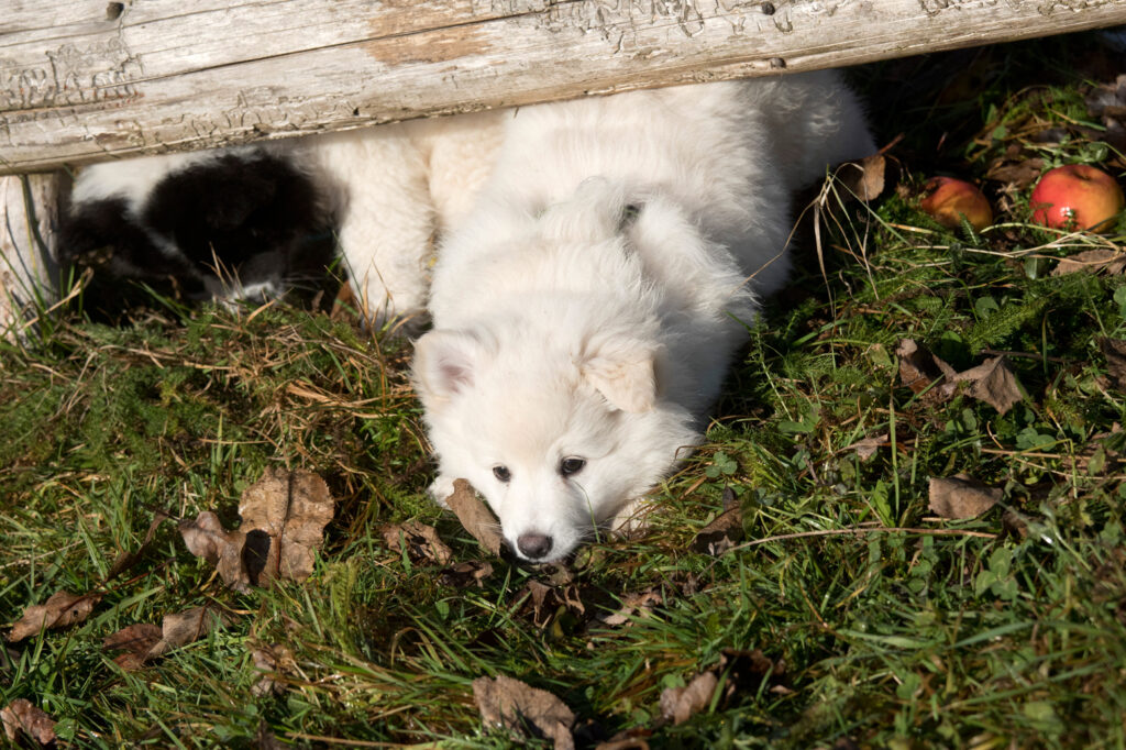Zugewandt und sehr intelligent ist der kleinere Weiße. Er ist gerne unterwegs, schlaft absolut tiefenentspannt und genießt sein Dasein. Er hat Freude am Spielen. Bei der Milch ist er immer mit vorne dabei, was auch der Grund ist, warum er bei seinen hellen gescheckten Bruder beim Gewicht aufholen konnte. Er zeigt viel Interesse an allen neuen Dingen, die ich ihnen in ihren Auslauf lege und erkundet genau. Spielzeug, Kisten, Decken, alles wird untersucht.