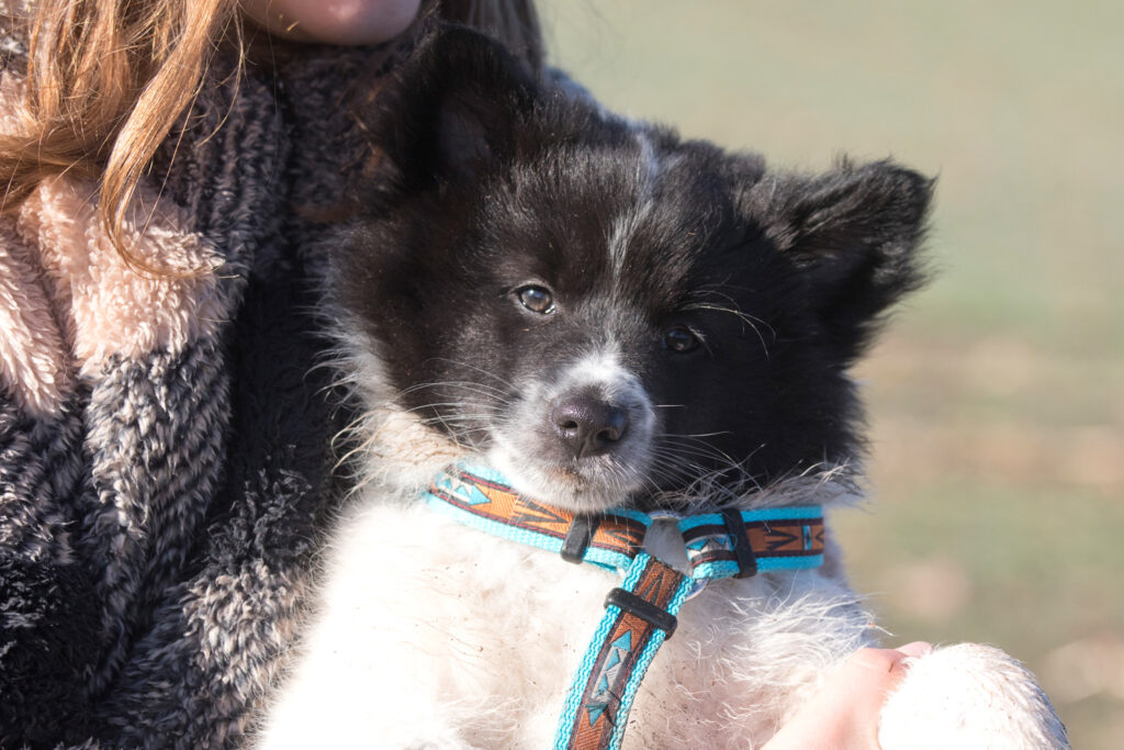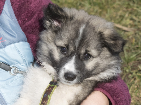 Dieser hübsche Welpe gibt mir mit seiner Farbe noch ein kleines Rätsel auf… wird er Wildfarbe oder Sable werden? Er ist sehr gesetzt und beständig. Seit er beim großen weißen Bruder an Gewicht aufgeholt hat, kann auch er sich gut an der Brust behaupten. Auch er kommt freudig auf meine Kinder zu gewackelt, wenn sie ihn besuchen. Kuscheln ist schön, gemütlich schlafen ist wichtig und zwischen durch spielen auch. Allerdings nicht so flummihaft wie seine schwarz gescheckten Brüder. Wenn er die Lust am Spiel verliert, ein anderer Bruder aber weiter nervt, dann sagt er es ihm auch. Er ist ein sehr angenehmer Schatz. Er liebt es, wenn ich ihnen Futter bringe und am liebsten schleckt er es von der Hand.