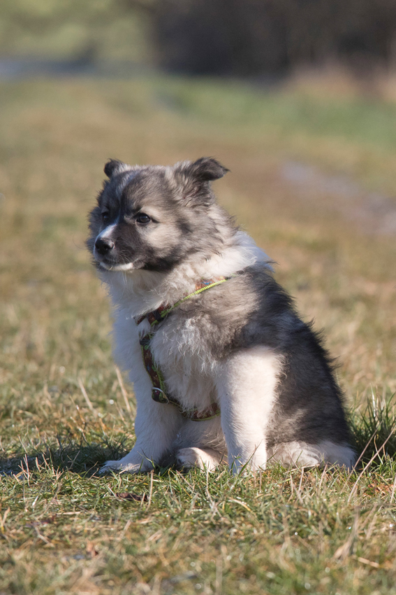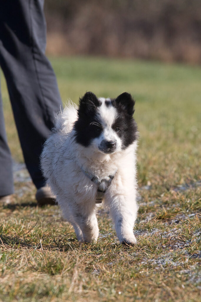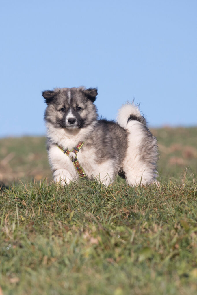 Unser Zweitgeborener will immer vorne mit dabei sein. Schon als Baby hat er immer wieder versucht unermüdlich an reichhaltige Milchquellen zu kommen. Er spielt und springt voller Begeisterung durch die Gegend, er wedelt mit dem Schwanz was das Zeug hält. Ohne Hemmung spielt er auch die Mama an, die ihm dann kurz sagt, dass auch so eine Frohnatur sie nicht einfach anzuspringen hat. Bei ihm nehme ich mir für die Begrüßung Zeit und achte darauf, dass er mich nicht anhüpft wie ein Wilder. Er spielt mit allen Geschwistern gerne. Durch seine Wendigkeit wird er selten in die Enge getrieben, so ist er ein sehr freundlicher Spieler. Dass er nicht der Tonangebende ist, das zeigt deutlich auch sein Fressverhalten. Kurz vor der Zufütterung war er der Leichteste im Wurf, weil er gegen die Geschwister einfach nicht durch gekommen ist. Er bekommt seit Anfang an sein eigenes Schälchen, dass er genug abbekommt. Er ist verspielt aber auch kuschelig, anhänglich und gemütlich wie ein kleiner Pandabär. Nägelschneiden ist bei ihm kein Problem, im Arm hält er ganz still und er schläft auch dort ein. Außerdem ist er ein heimliches Fotomodeltalent, von ihm könnte ich immer zig Bilder machen, weil er so schön posiert.